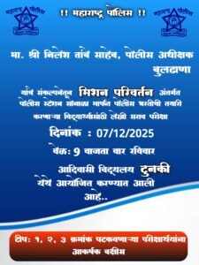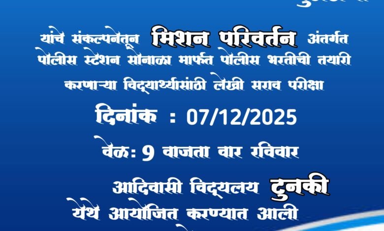 संग्रामपूर तालुक्यातील सोनाळा पोलीस स्टेशन यांचे स्तुत्य उपक्रम मा. श्री निलेश तांबे जिल्हा पोलीस अधीक्षक यांच्या संकल्पनेतून मिशन परिवर्तन हि संकल्पना पूर्ण जिल्हाभर पोलीस दल राबवित असून या मिशन परिवर्तन अंतर्गत ठाणेदार मा. श्री संदीप काळे सोनाळा पोलिस स्टेशन यांच्या मार्गदर्शनाखाली पोलीस भरतीसाठी तयारी करत असलेल्या विद्यार्थ्यांसाठी स्तुत्य उपक्रम पोलीस भरती लेखी सराव परीक्षा 07 डिसेंबर 2025 रोजी आदिवासी कनिष्ठ कला महाविद्यालय टुनकी येथे आयोजीत करण्यात आली आहे . पोलीस भरती लेखी सराव परीक्षेत प्रथम द्वितीय आणि तृतीय पटकवणाऱ्या परीक्षार्थींनी आकर्षक बक्षीस वितरण करण्यात येईल तरी या पोलीस भरती लेखी सराव परीक्षेत जास्तीत जास्त संख्येने विद्यार्थ्यांनी सहभागी होत या सराव परीक्षेचा फायदा घ्यावा असे आवाहन सहाय्यक पोलीस निरीक्षक श्री संदीप काळे पोस्टे सोनाळा यांच्या वतीने करण्यात आले आहे . रविवार दिनांक 7 डिसेंबर रोजी सकाळी 09 वाजता आयोजित करण्यात आलेली आहे . परीक्षार्थींनी पो कॉ श्री तितरे मो नं 8975524557 यांच्याशी संपर्क साधावा जेणेकरून योग्य व्यवस्था करण्यात येईल असे आवाहन सोहळा गोष्टीच्या वतीने करण्यात आले आहे .